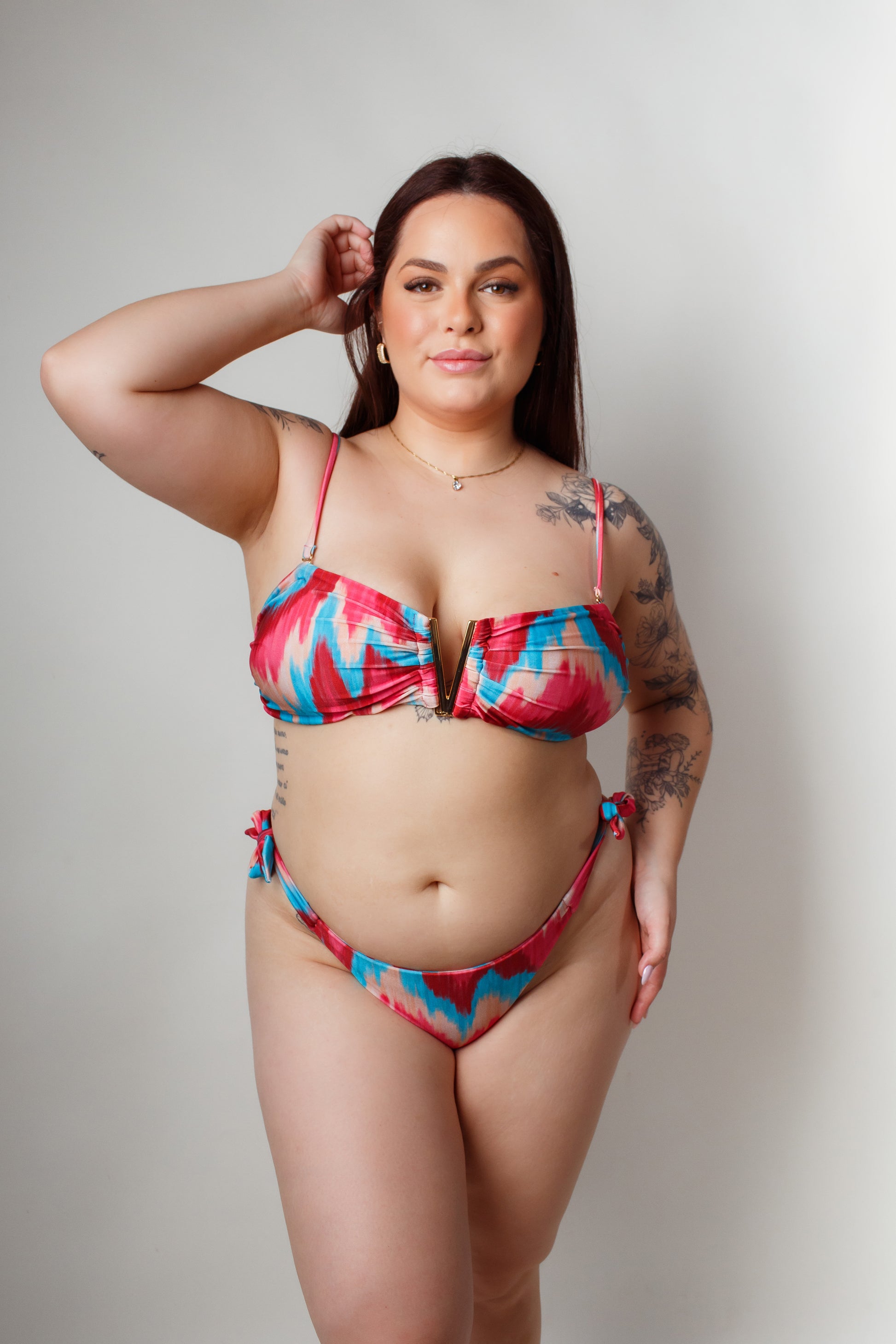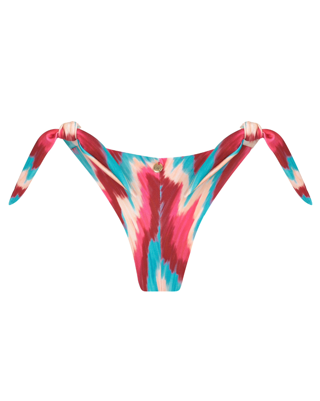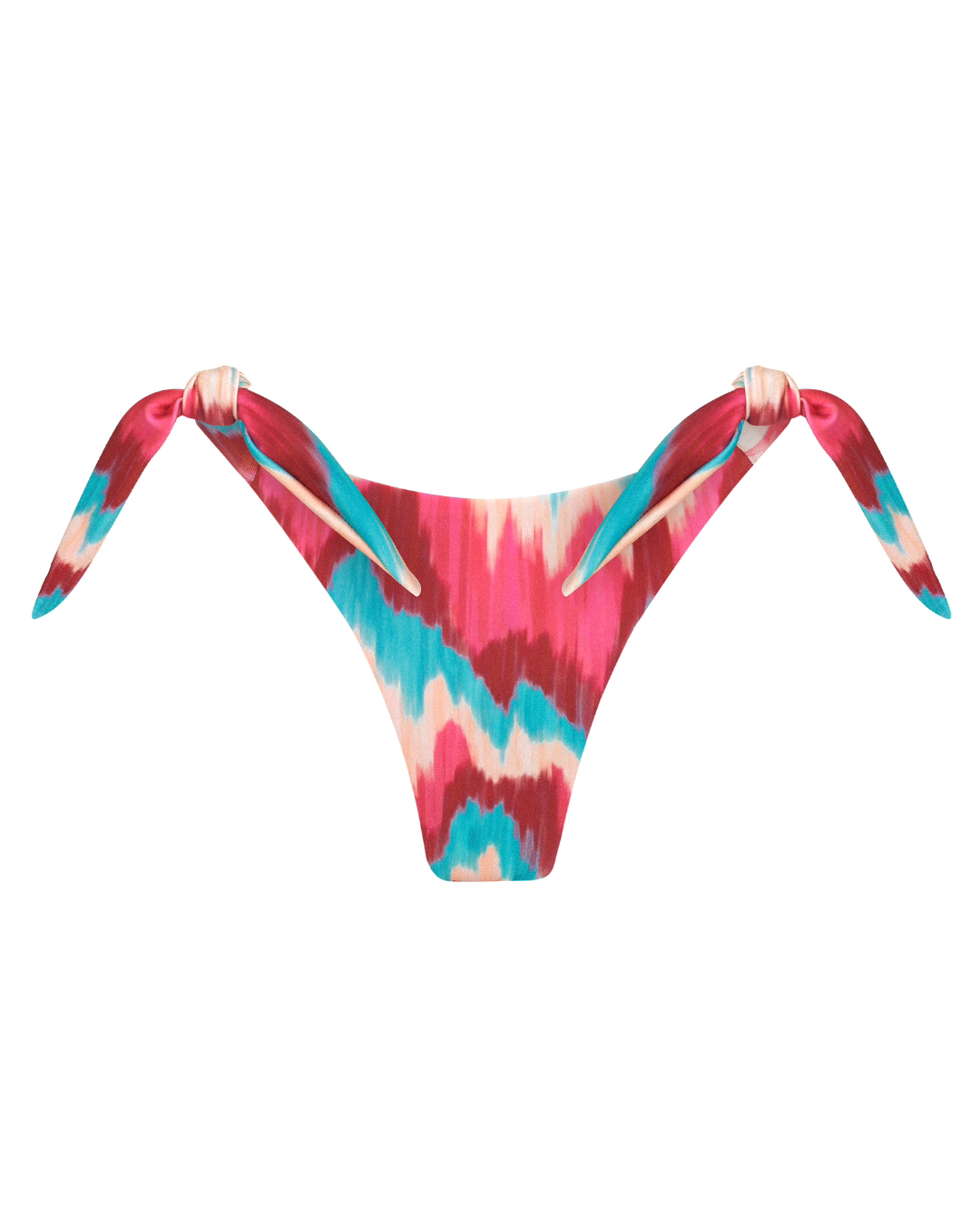 Calcinha com dois laços grossos laterais que acompanham o corte. Não possui elástico interno nas partes de amarrar, por isso se ajusta bem ao corpo, não deixando marcada a cintura e o culote. Possui recorte empina bumbum, fino acabamento e costuras invisíveis.