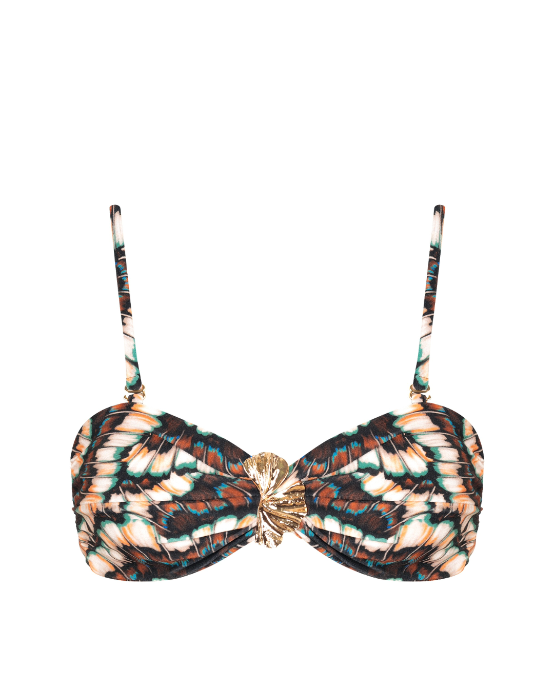 A característica mais marcante desse biquíni é a presença de apenas um aro que sustenta e une as duas taças, contornando toda a parte de baixo do busto.
