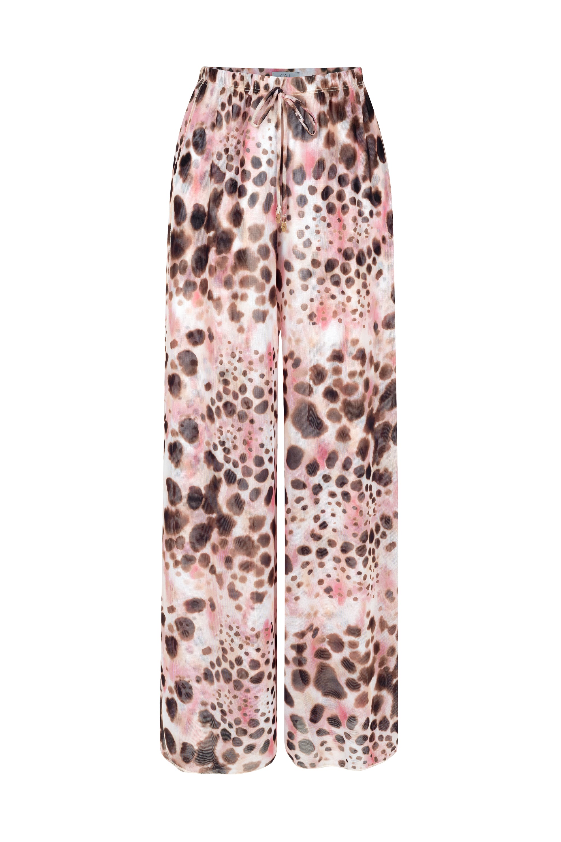Calça cintura alta com caimento amplo e fenda lateral.