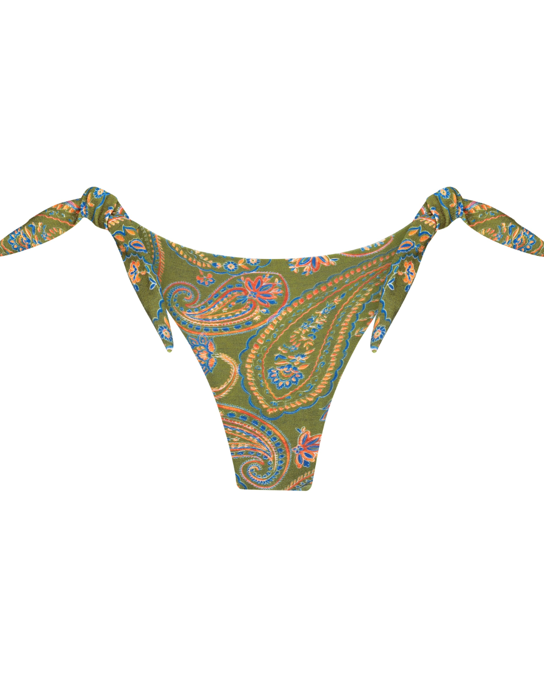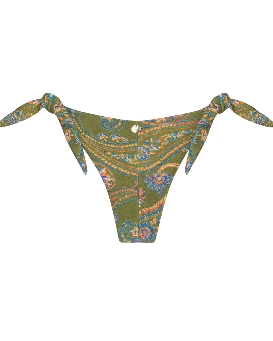 Calcinha com dois laços grossos laterais que acompanham o corte. Não possui elástico interno nas partes de amarrar, por isso se ajusta bem ao corpo, não deixando marcada a cintura e o culote. Possui recorte empina bumbum, fino acabamento e costuras invisíveis.