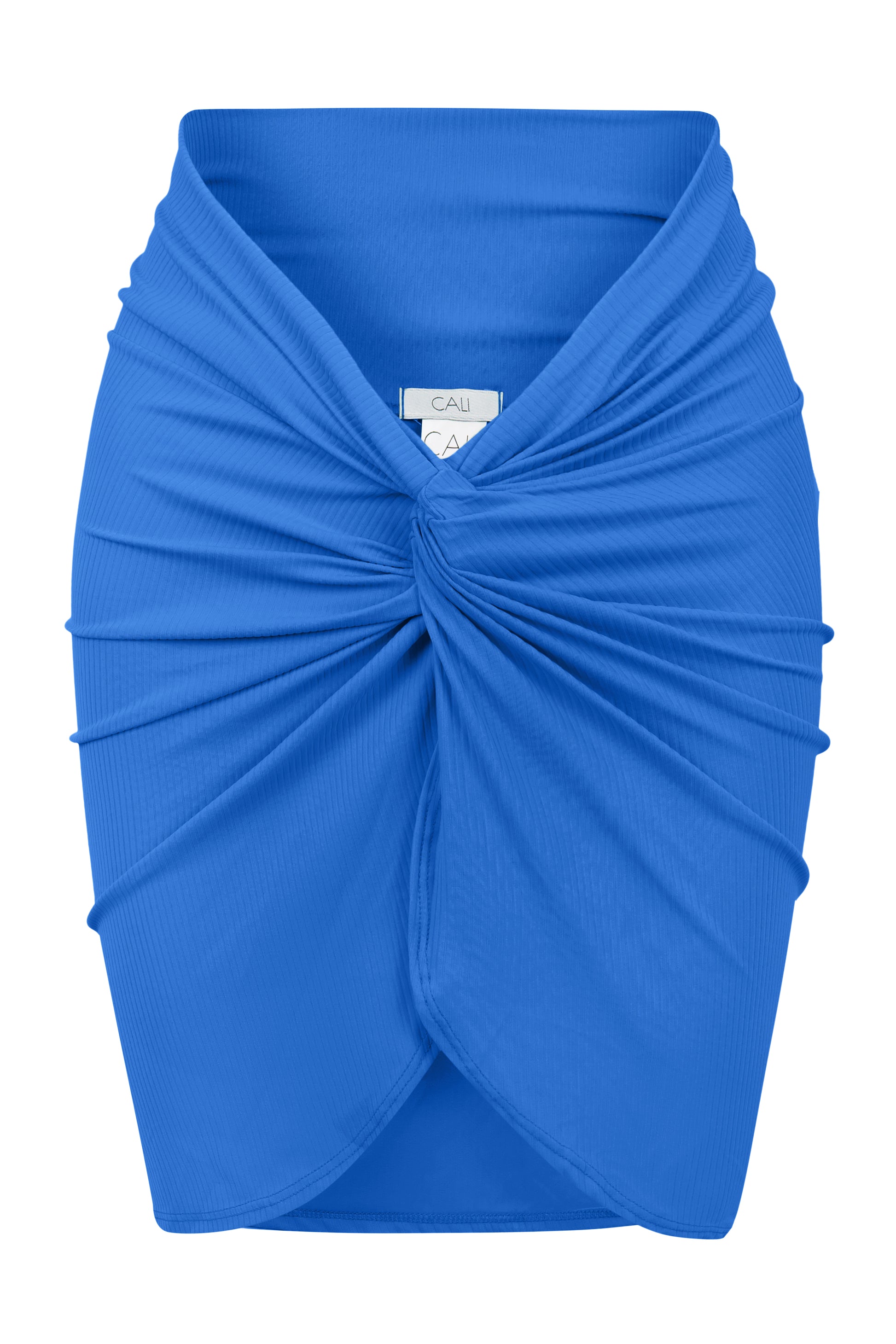 Saia curta fixa transpassada na frente. O produto é feito do mesmo material dos biquínis da estampa correspondente, sendo leve mas sem transparências.