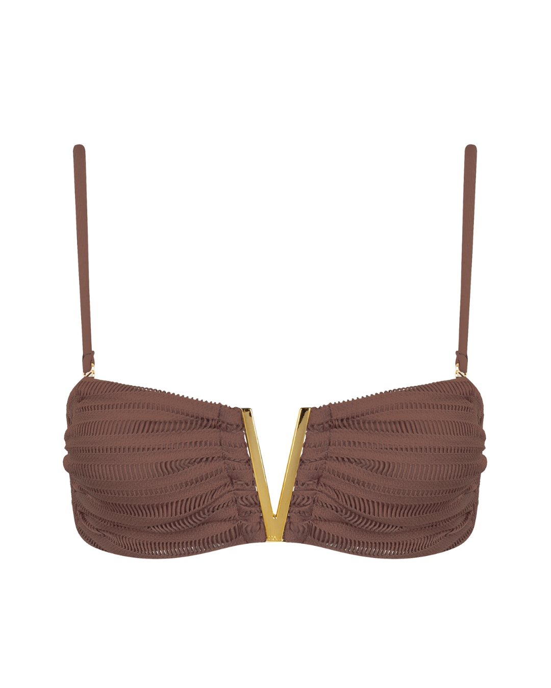 A característica mais marcante desse biquíni é a presença de apenas um aro que sustenta e une as duas taças, contornando toda a parte de baixo do busto.