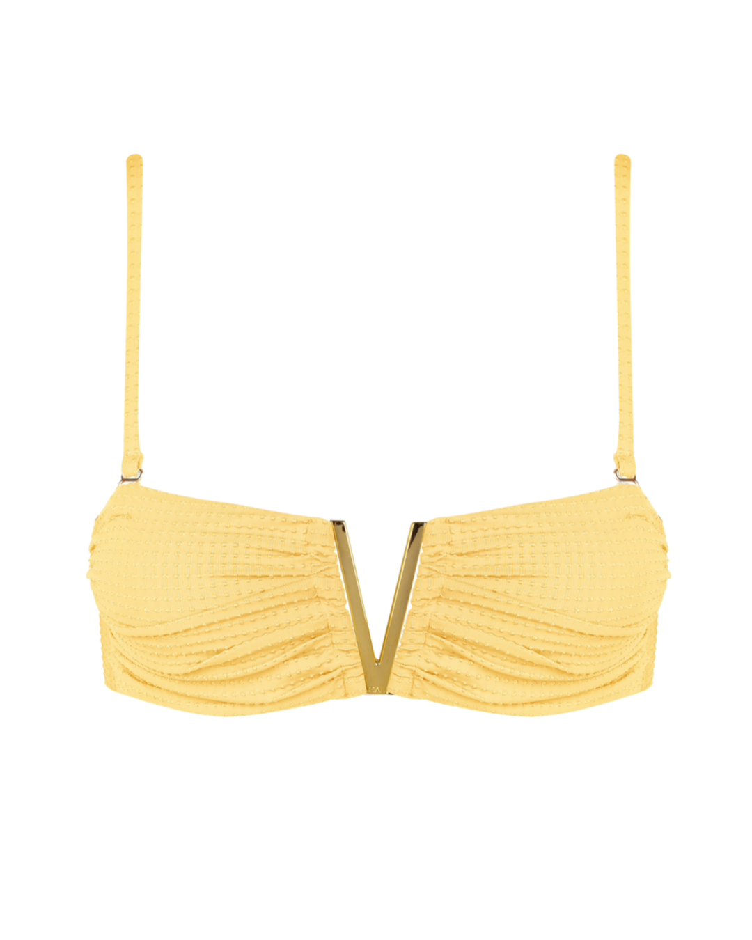 A característica mais marcante desse biquíni é a presença de apenas um aro que sustenta e une as duas taças, contornando toda a parte de baixo do busto.
