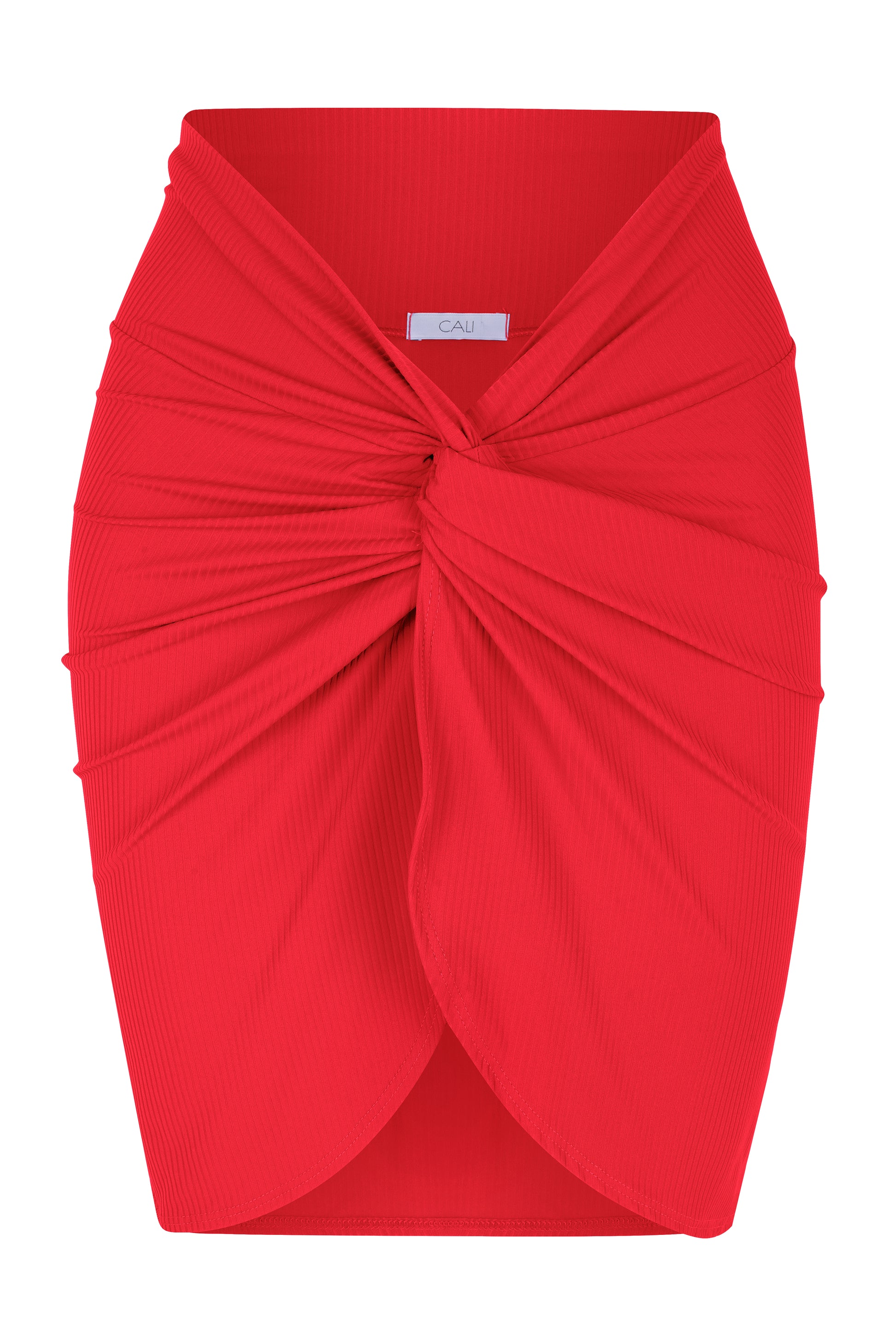 Saia curta fixa transpassada na frente. O produto é feito do mesmo material dos biquínis da estampa correspondente, sendo leve mas sem transparências.