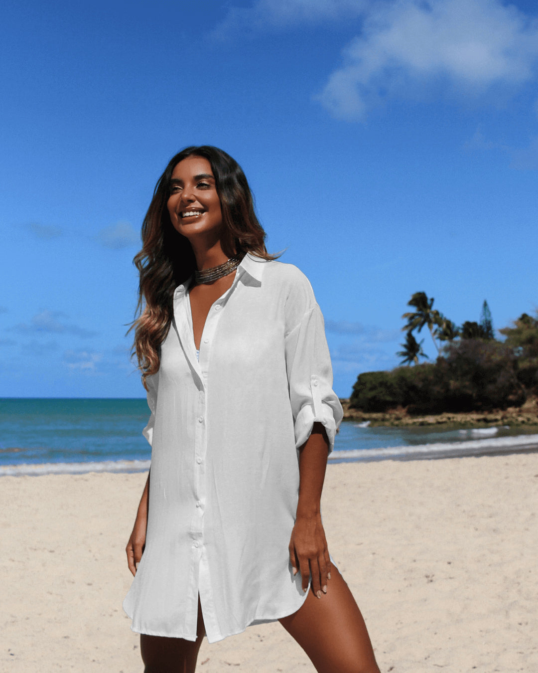 O primeiro deles é o tamanho da camisa. A ideia é cobrir o bumbum, portanto, os melhores modelos de camisa para saída de praia são as chemises (mais longas) e as oversized (modelagem mais ampla).