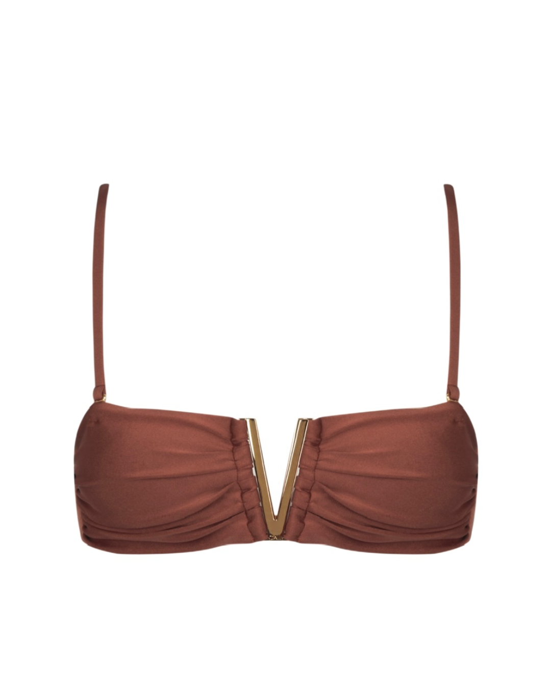 A característica mais marcante desse biquíni é a presença de apenas um aro que sustenta e une as duas taças, contornando toda a parte de baixo do busto.