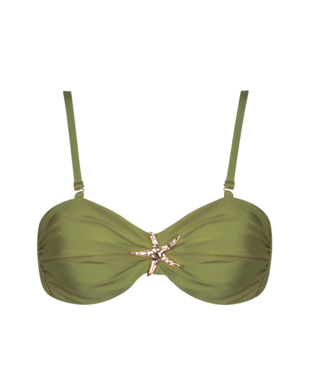 A característica mais marcante desse biquíni é a presença de apenas um aro que sustenta e une as duas taças, contornando toda a parte de baixo do busto.