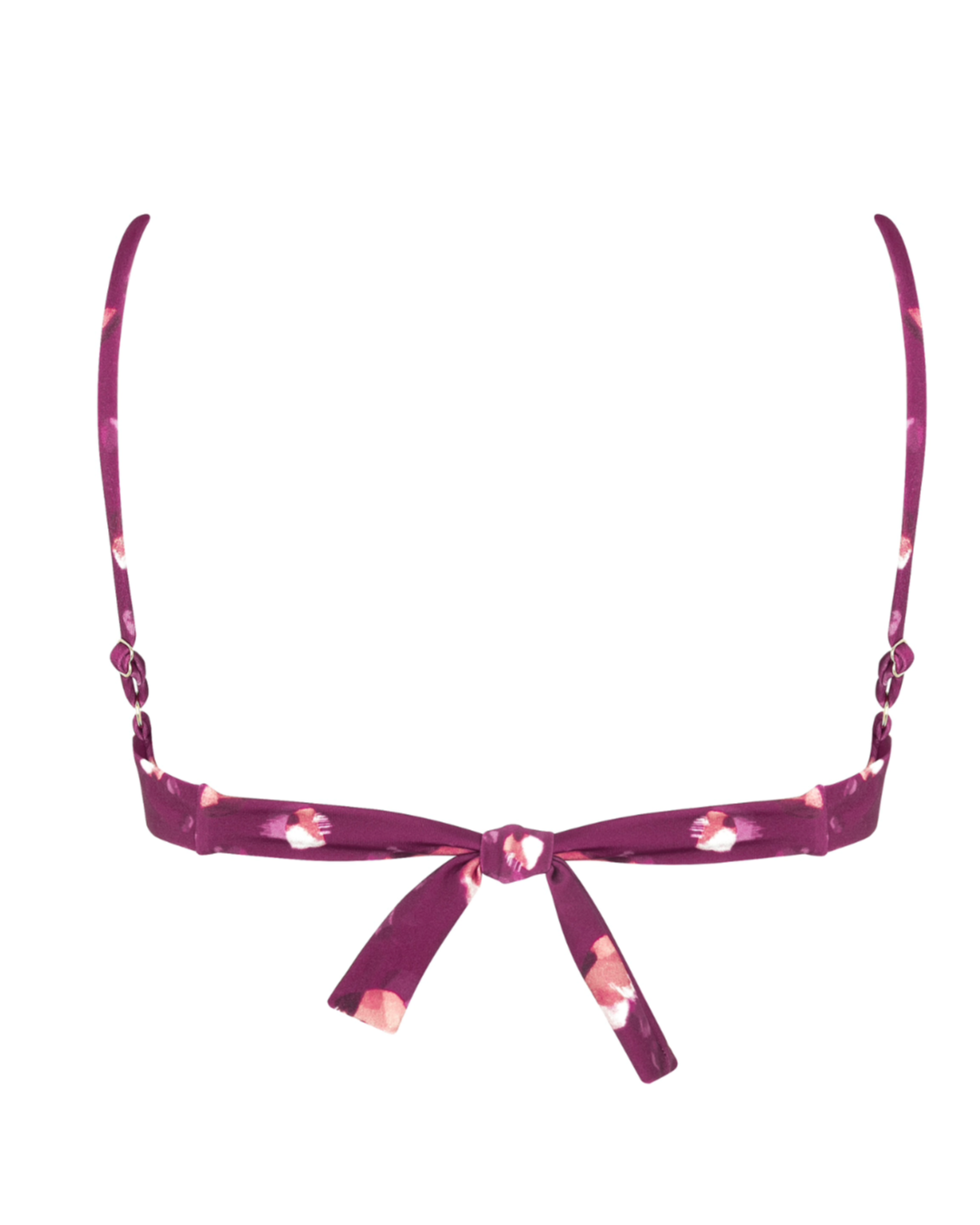 O sutiã aro simples da Cali for Sun tem alças finas reguláveis e as taças não têm abertura para encaixar bojo. O ajuste nas costas é feito com amarração para encaixar no corpo na sua medida exata.