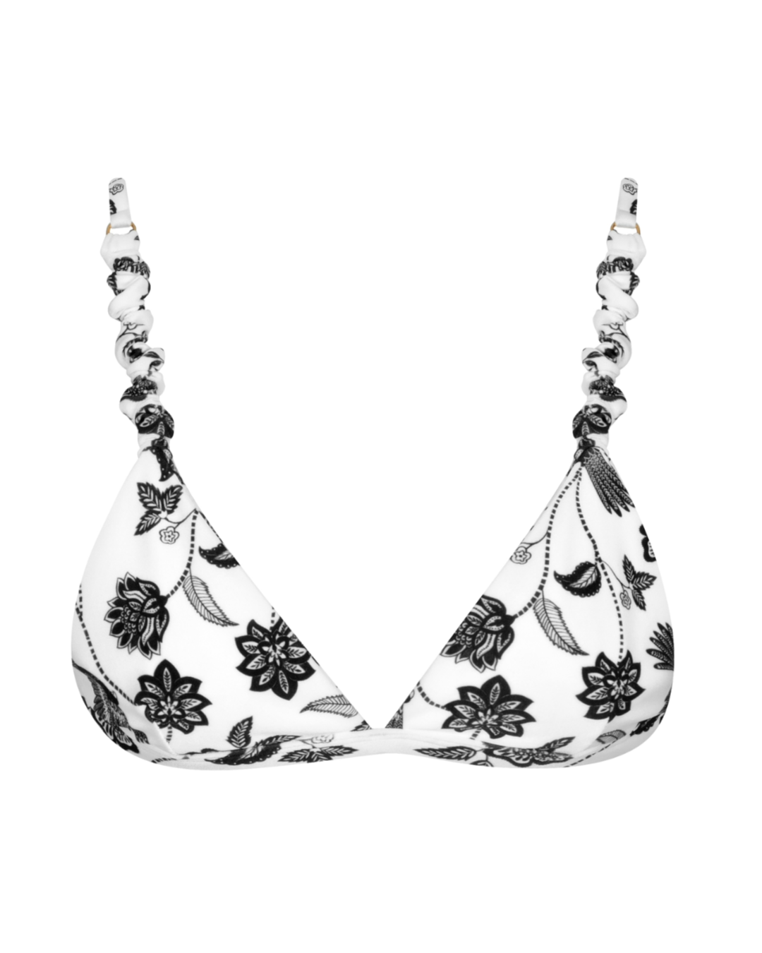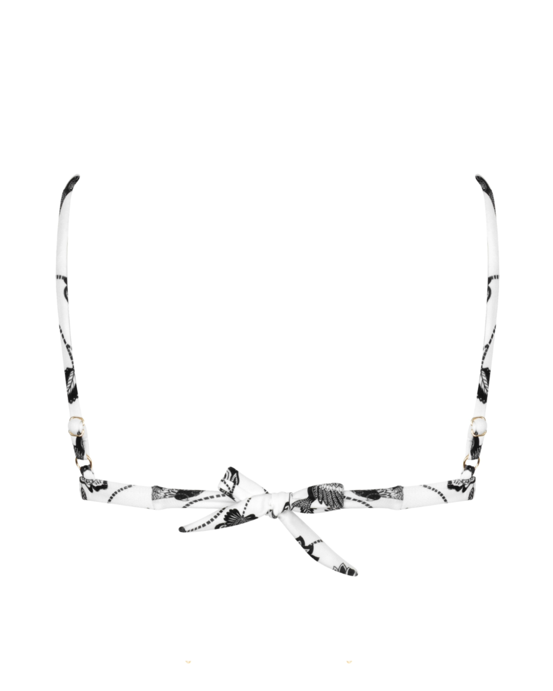 Top com alças reguláveis, com frufru na alça, amarração nas costas, fino acabamento e costuras invisíveis na laterais, garantindo maior conforto durante o uso.