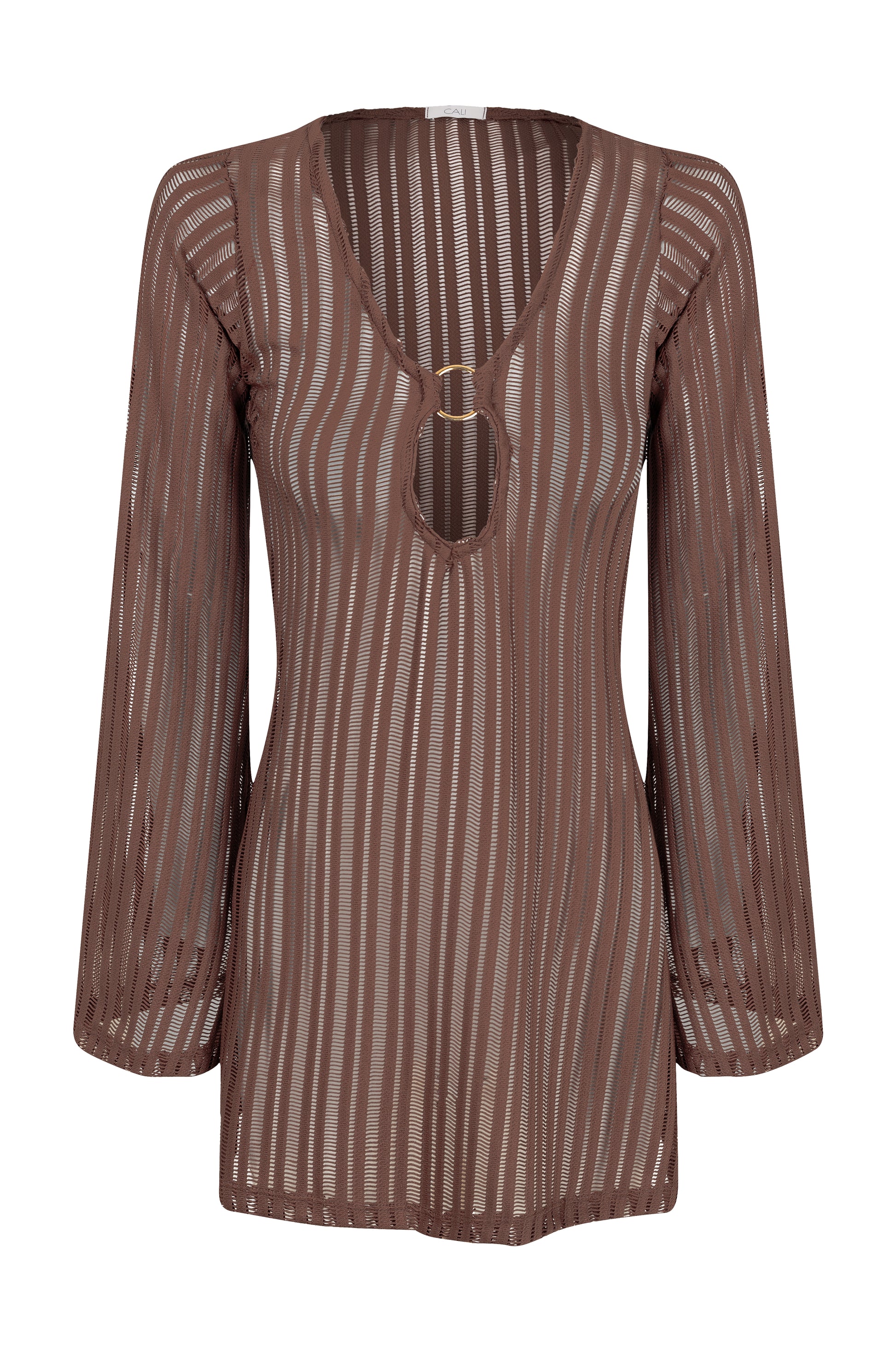 Vestido de praia curto com detalhe frontal, manga flare e caimento soltinho.