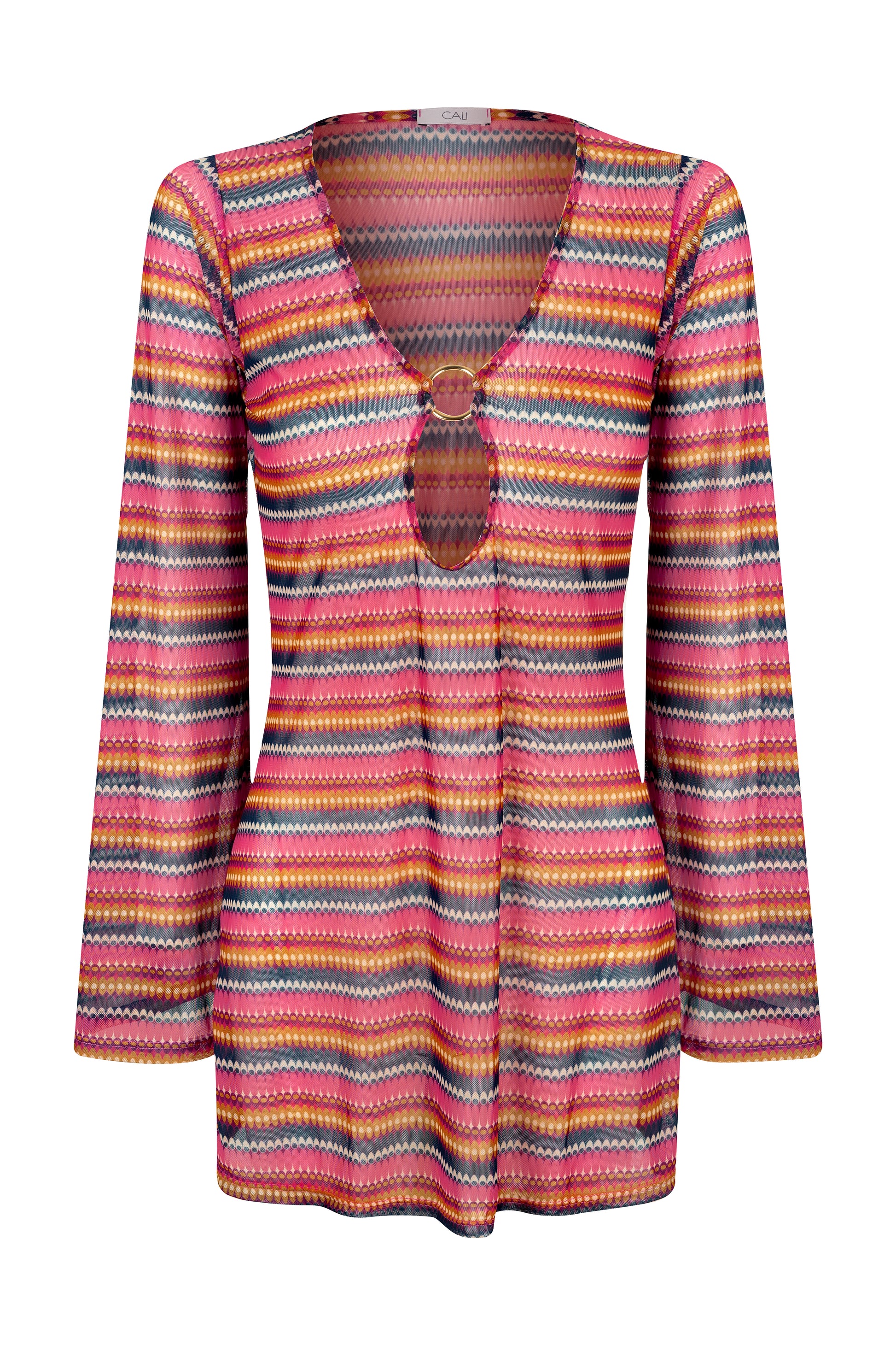 Vestido de praia curto com detalhe frontal, manga flare e caimento soltinho.